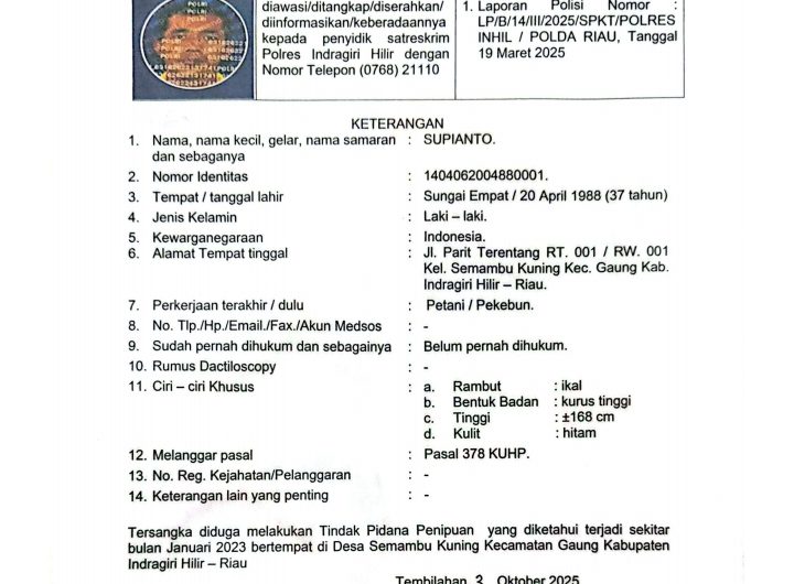 Polres Indragiri Hilir Terbitkan DPO Terhadap Tersangka Kasus Penipuan Lahan DI Desa Semambu Kuning.